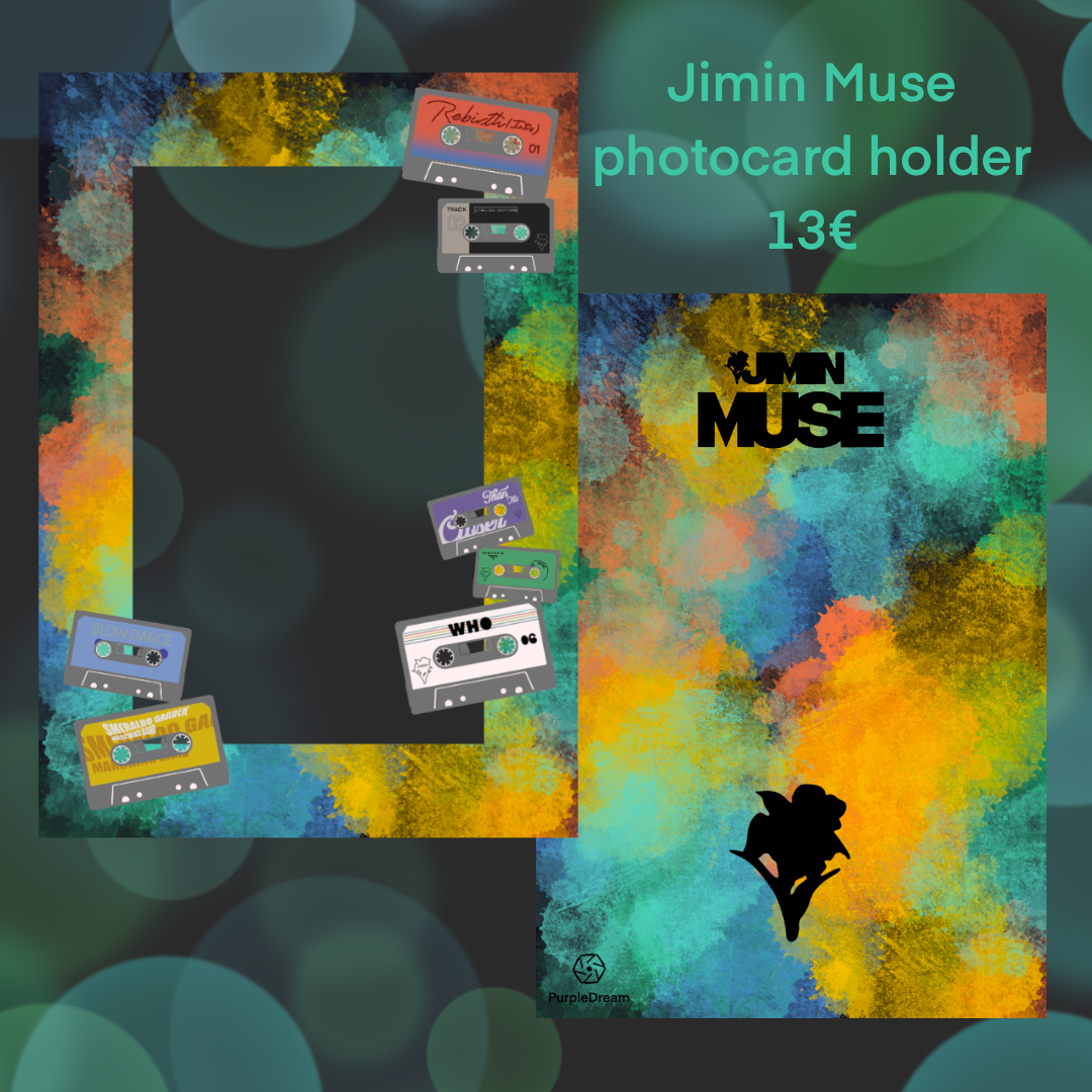 The acrylic holder is inspired by Jimins album Muse. The size fits regular pcs. It’s designed as a keychain and will come with a ball chain to hang on your bag.